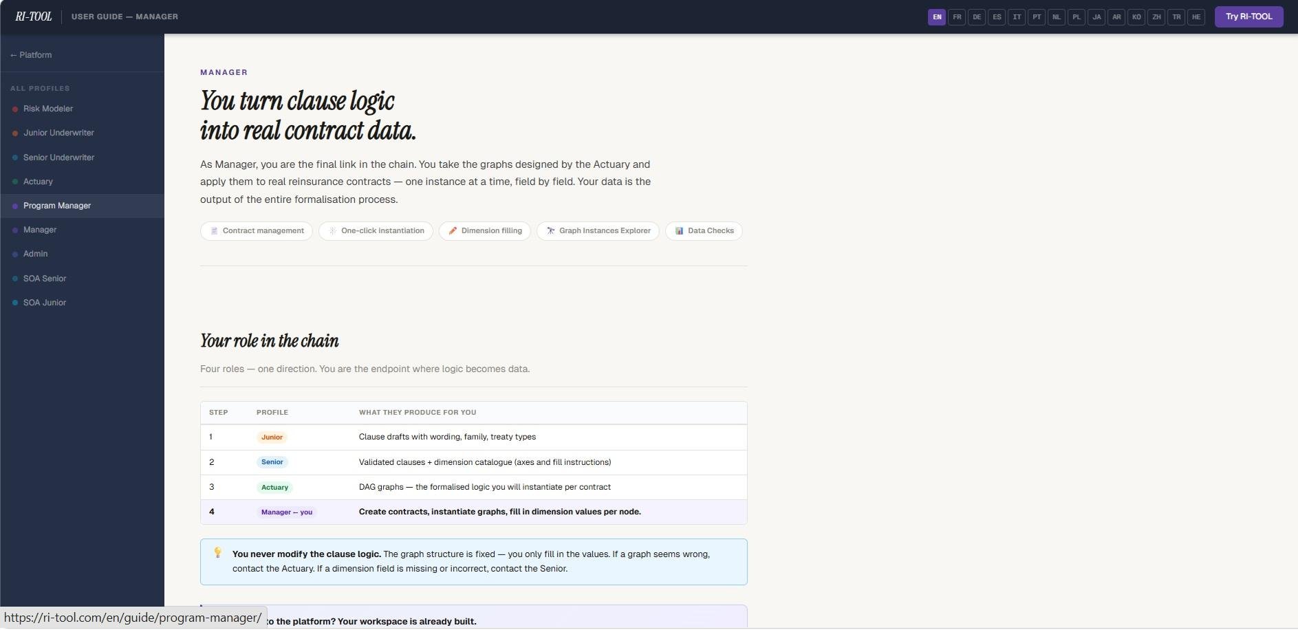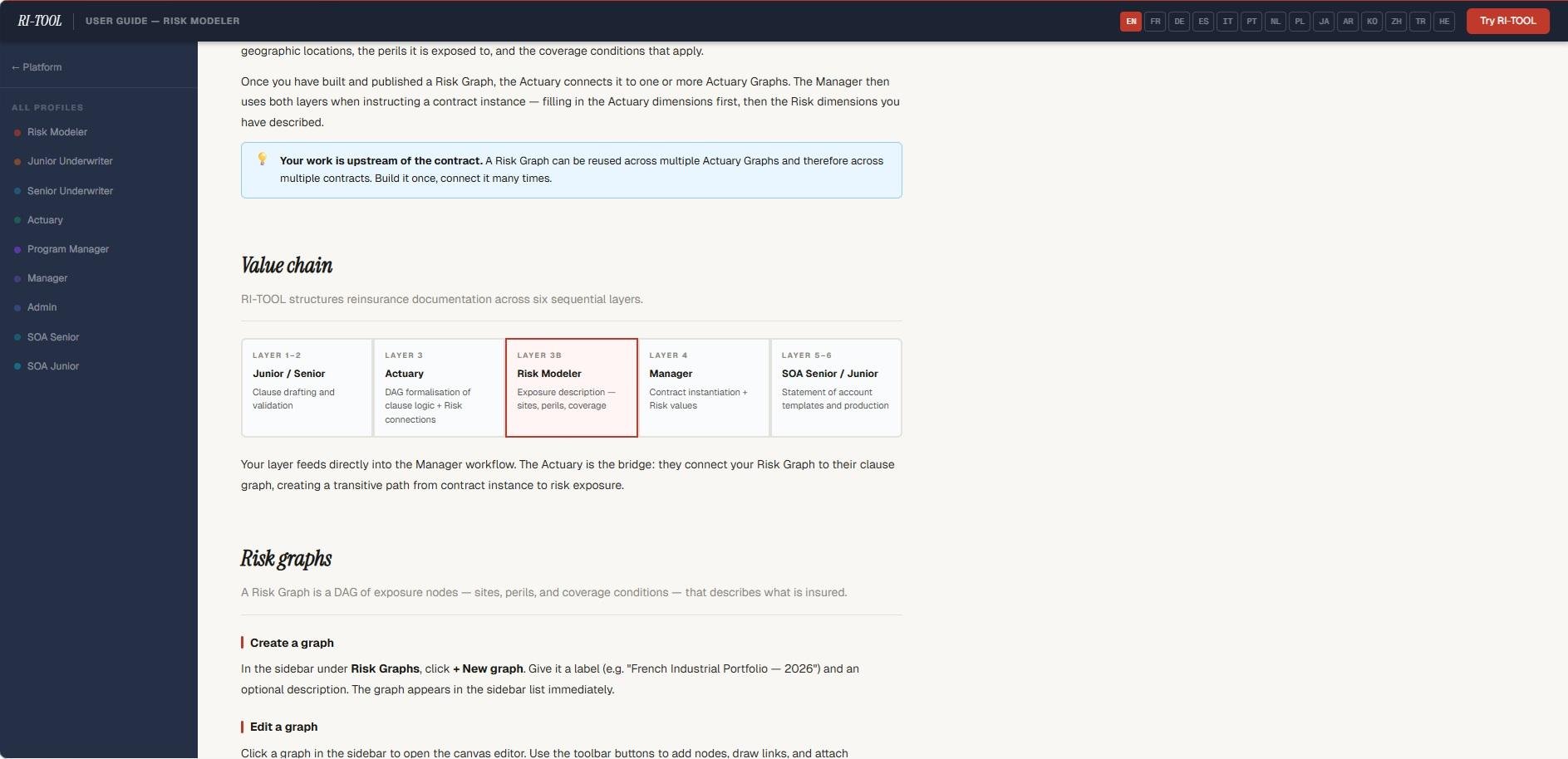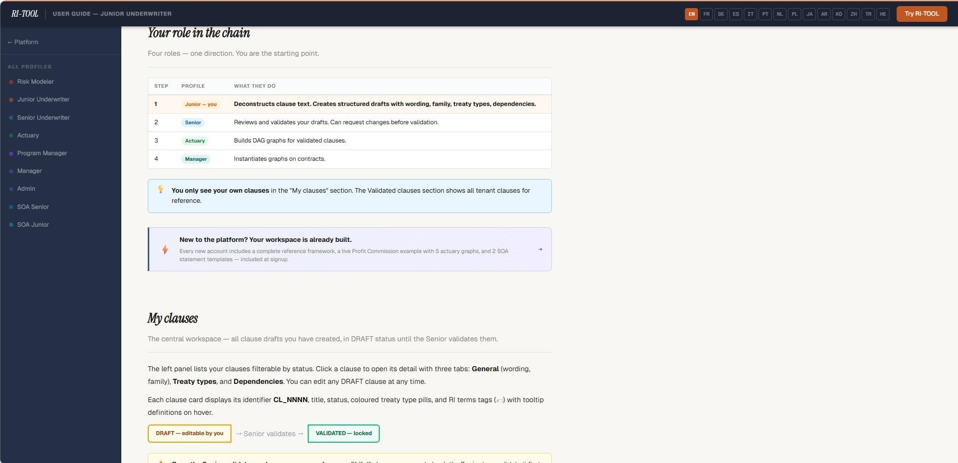 RI-TOOL is a sophisticated multi-tenant SaaS solution designed specifically for reinsurance experts to effectively document, organize, and codify treaty clauses. Each clause is represented as a directed acyclic graph (DAG) of operands, allowing for the accurate and machine-readable formalization of intricate contractual logic that traditional spreadsheets fail to deliver. The platform facilitates the entire reinsurance process across nine specialized roles, including clause drafting by Junior underwriters, validation by Senior underwriters, actuarial formalization by Actuaries, exposure graph modeling by Risk Modelers, contract creation by Managers, and statement-of-account generation by both SOA Seniors and SOA Juniors. Each tenant is provided with a dedicated workspace that comes pre-equipped with a foundational library containing standard clauses, basic DAG graphs (akin to LEGO bricks), and SOA templates that address areas such as Profit Commission and Loss Participation. Additionally, the platform features a comprehensive glossary of 298 terms available in 14 different languages, including English, French, German, and Spanish, among others. Furthermore, all documents are securely stored utilizing AES-256-GCM encryption, ensuring the utmost protection of sensitive information. This robust framework not only streamlines the workflow but also enhances collaboration among reinsurance professionals.