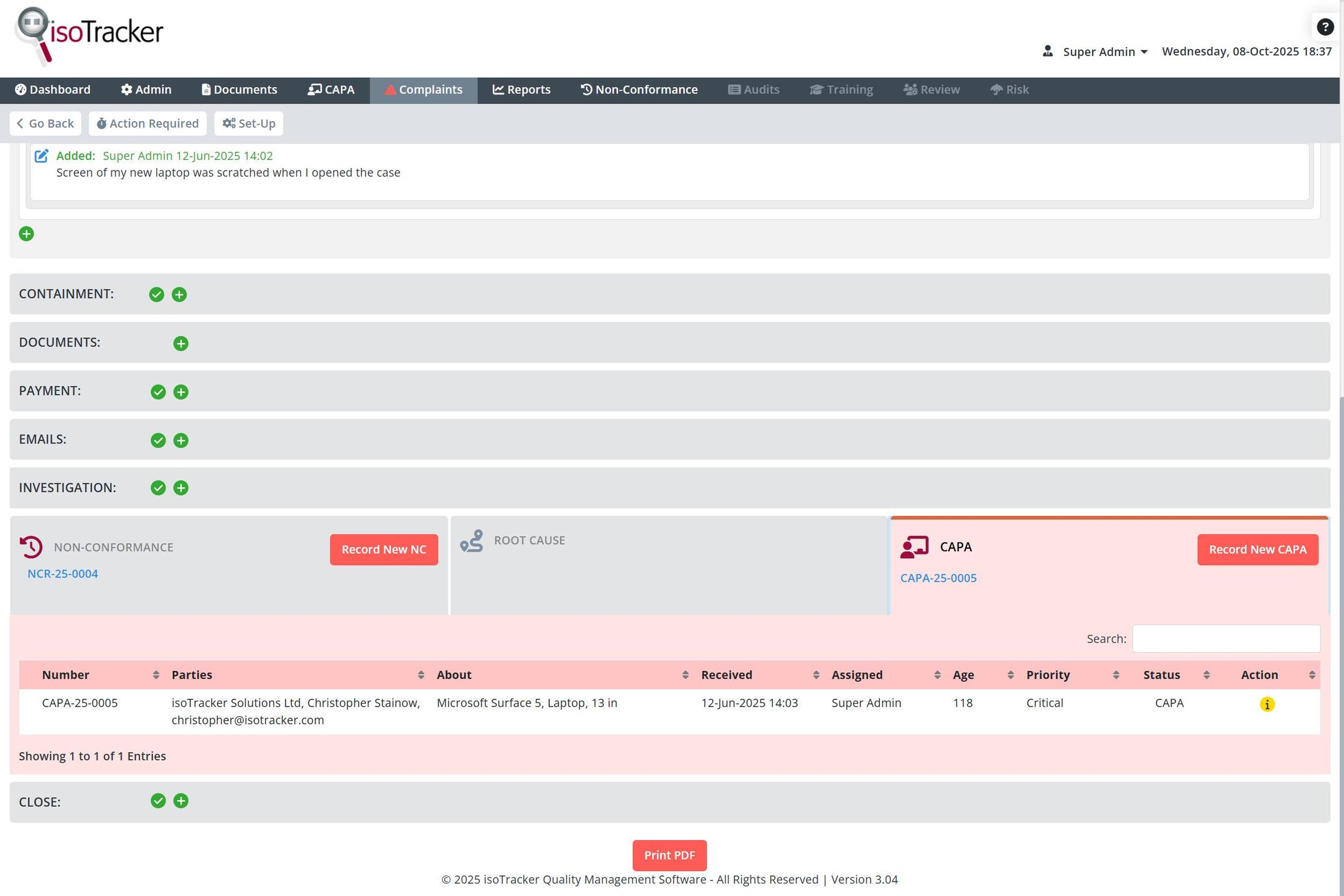 The isoTracker Complaints Management system is a cloud-based solution designed to efficiently record and handle customer complaints. This comprehensive tool empowers administrators to designate team members responsible for investigating and pinpointing the underlying causes of complaints. Additionally, isoTracker Complaints Management offers users the capability to analyze past complaints and uncover trends, facilitating the development of proactive measures to prevent future issues. By streamlining the complaints process, this solution enhances customer satisfaction and organizational responsiveness.
